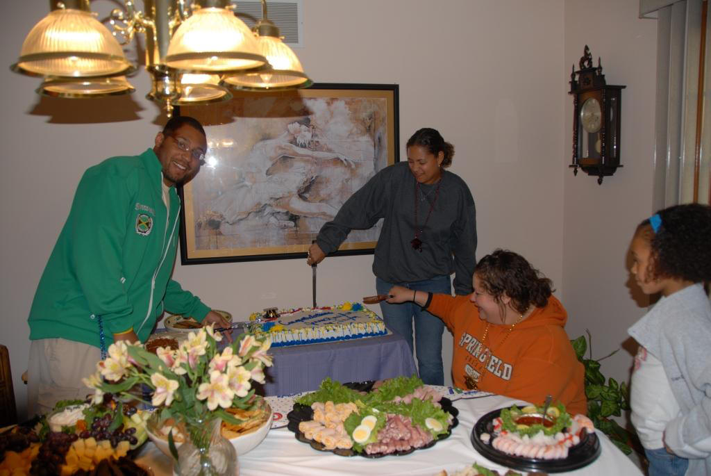 Above to right: Everyone is looking with angst... "Will Taylor even try to cut the cake properly?" LOL. We're all forever teasing our cutie Taylor (his eyes are extraordinary!). Breighan and Taylor have been like vinegar and oil since birth... you'd think them brother and sister instead of cousins... yet they do love each other dearly. It took them to be in their 20s and University Graduates to finally appreciate one another. {From left to right: Little Hailey, Taylor's mom (my cousin) Letitia Dewith-Anderson, , Moi, my dearest friend for three decades Iris Lugo (we had the party at her house), and Iris' daughter {Hailey's mom} Alison Powers Storm (my goddaughter).