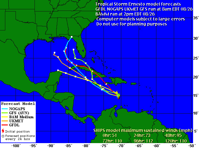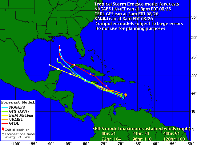 Just one day later, suddenly looks like the Yucatan might eke out with a serious curve by Ernesto up to the Panhandle. Could this be accurate??!! Yikes!
