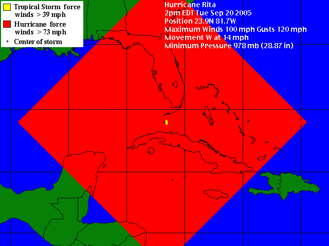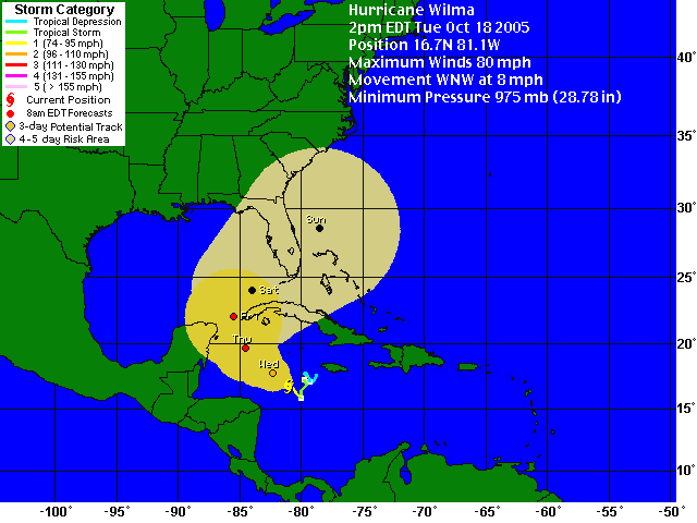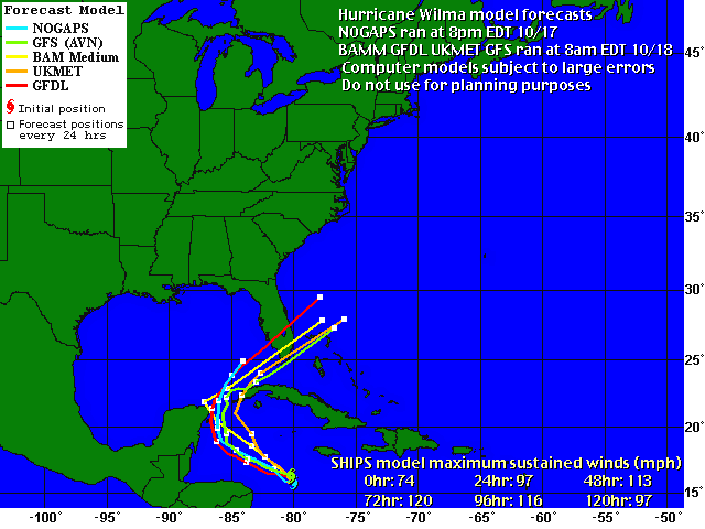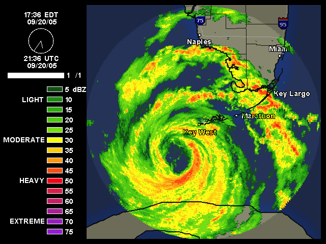 Then came the Wind and the Wilma. For Wilma, since she had been a Category 5 right before she hit the Yucatan Peninsula, and since she was forecasted to be either a high Category 2 or 3 when she lands on the southwestern coast of Florida. She would have to make a 90 degree turn from the Yucatan... and she did just that. The Keys would be hit. Not much doubt about that.