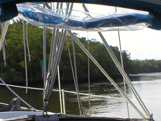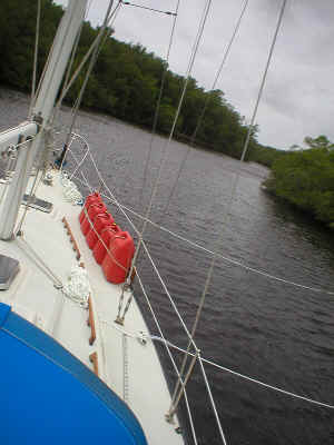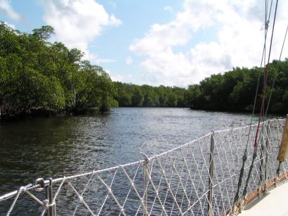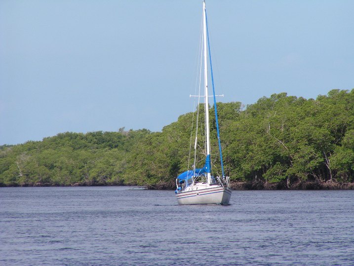 We explored as much of the Little Shark as possible. Jim and Bill would get in Bongo and go do depth soundings in areas we were unsure of. We'd mark on our chart notes of shallower spots and silted in areas to steer clear of (like the formerly unmarked funky little spot ran aground on!). This entire trip would be very important come time for us to escape here for protection from hurricanes. The 2004 Hurricane Season proved we had done just the right thing by coming here a year earlier. We went to Little Shark for both Hurricanes Charley and Ivan. We knew right where to go and were nestled in beautifully! Safe and sound!