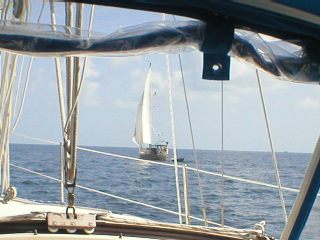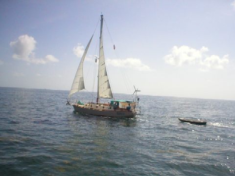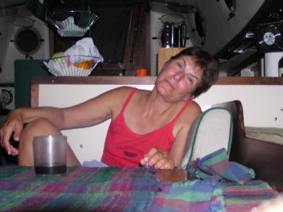Rafted up with s/v Drummer for a lunch break. Kathleen made "Shrimp and Rice Salad ala Charmaine." It was absolutely delicious! She took all the things I love: olives, shrimp, eggs, rice, cheese... and made it into a wonderful cold salad that was scrumpdillyicious! We make it often even now. Sure do miss our mates, Jim and Kathleen (aka "Eagle Scout" and "Leen), Charmaine's affectionate nicknames for them). They were our next-slip neighbors at Dockside in Marathon. The couple always busy modifying and improving their beautiful steel sailboat, Drummer (and their dinghy Bongo). I just love those names. They went cruising as of 2004 and as of March 2005 they are volunteering their services to the Ivan clean-up in Grenada. Two fantastic, loving people. Truly like family to us. Can't wait to join them someday soon!