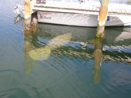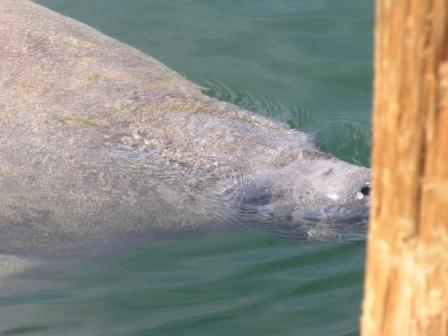Bill took this shot of a manatee while standing on our finger pier as s/he grazed on the algae of this small fishing boat. Note the wide fan-like tail. They are graceful mammals, though they look awkward. They can weigh a ton. Gentle, but very very powerful.