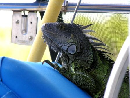 We have three Iguanas here that are very curious. I've done some reading up on them and experts say they are even more curious than cats. I can attest to that truth! Above, a green iguana (not native to the Keys and are usually escaped or let loose pets) relaxes on our Sport Seats. The iguanas can be a bother as they grow to about six feet in length and eat a ton of foliage, including your flowers and garden. The Keys are looking for ways to eradicate them. They just look like Godzilla to me. Once, the big red iguana was on our boom and wouldn't budge. Everyone BUT us got pictures of it... he soon bailed, when Bill threatened his solace, and he dove headfirst into the canal. You'd think they would have trouble boarding the boat... they obviously have no trouble at all, and they'll do a Greg Louganis in a heartbeat. Monsters they are. Cute to look at from afar... but the first time you clean up or slip on their poop... you'll reconsider their "cuteness."