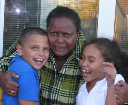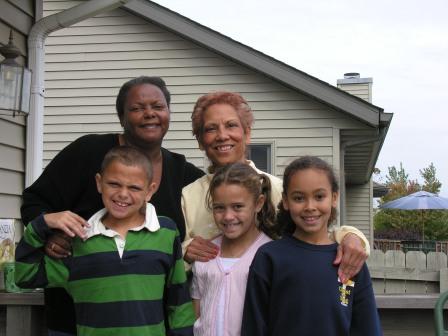 Dearest friend Iris V. Lugo stands with me while our grandkids, L'il Bj, Diana, and sweet Hailey smile.